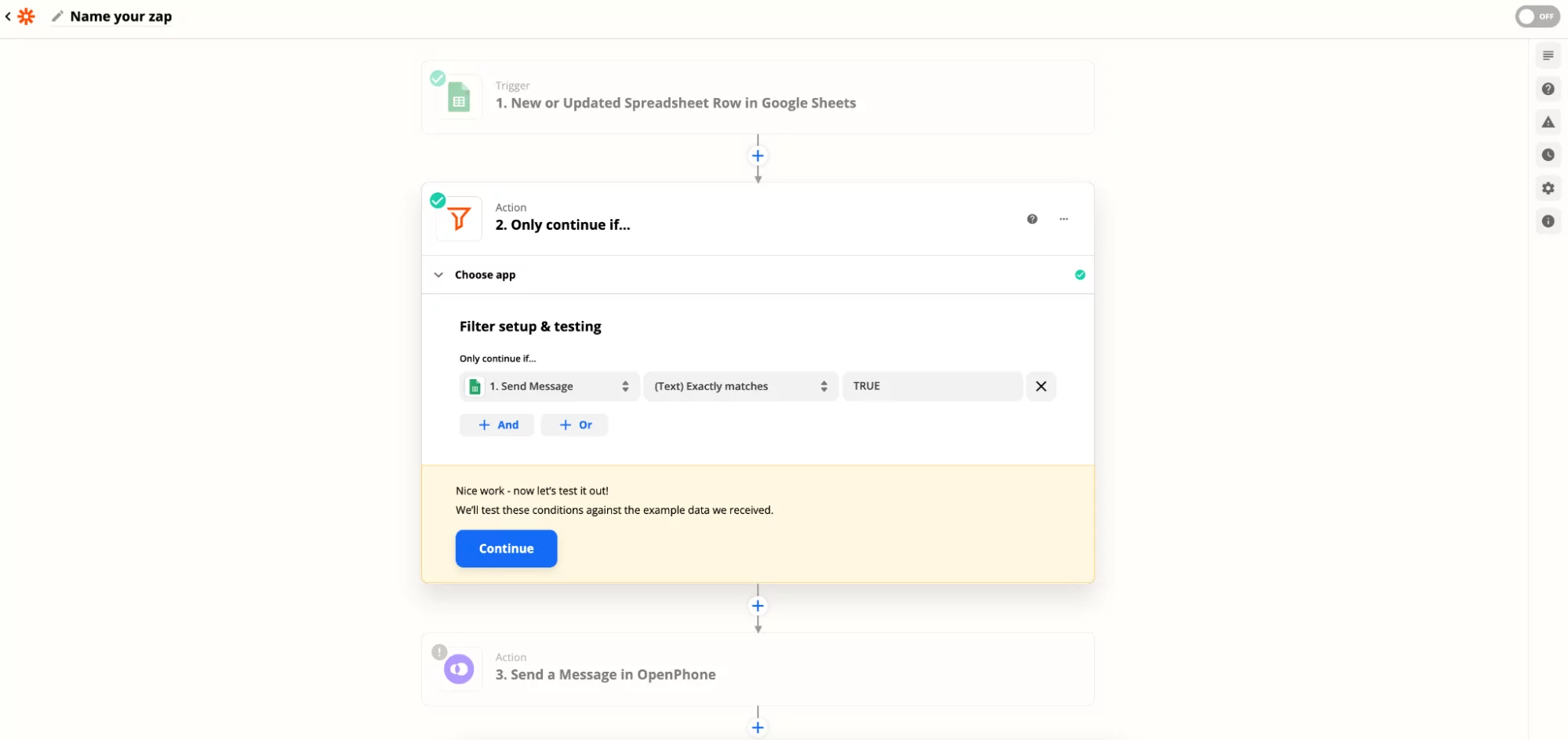 Column D lets you check which specific contacts in a spreadsheet receive a message once the Zap is set up. Hold off checking that for now until youâve set up the Zap.